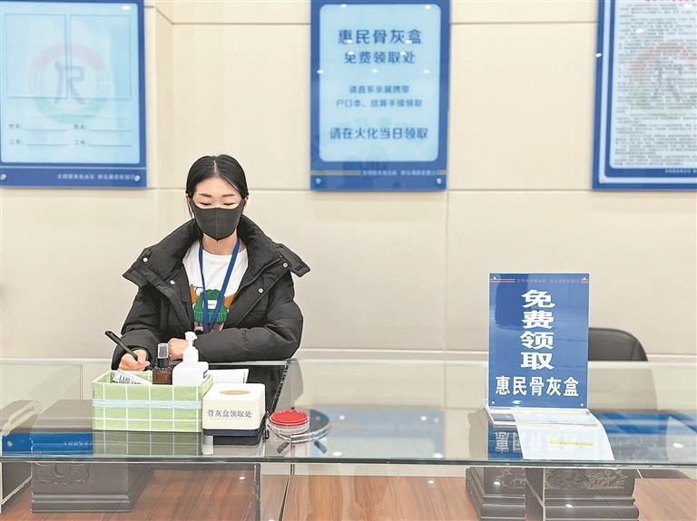 郑州市殡葬事务服务中心一隅,设有惠民骨灰盒免费领取处。河南日报记者 赵大明 摄